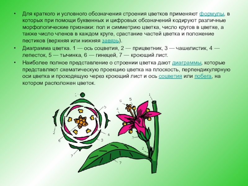 помощи буквенных и цифровых обозначений кодируют различные морфологические признаки: пол и симметрию цветка, число кругов в цветке, а также число членов в каждом круге, срастание частей цветка и положение пестиков (верхняя или нижняя завязь).