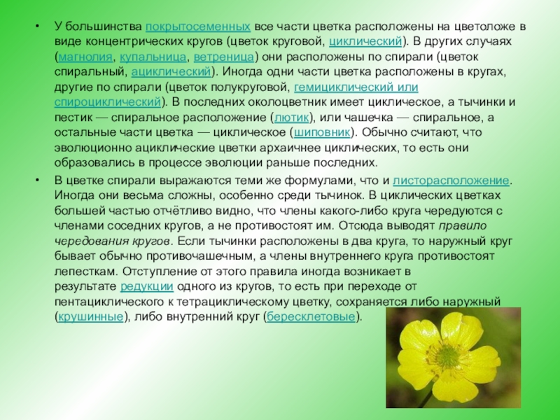(цветок круговой, циклический). В других случаях (магнолия, купальница, ветреница) они расположены по спирали (цветок спиральный, ациклический). Иногда одни части цветка расположены в кругах, другие по спирали (цветок полукруговой, гемициклический или спироциклический). В последних околоцветник имеет циклическое, а тычинки и пестик — спиральное расположение (лютик), или чашечка — спиральное, а остальные части цветка — циклическое (шиповник). Обычно считают, что эволюционно ациклические цветки архаичнее циклических, то есть они образовались в процессе эволюции раньше последних.