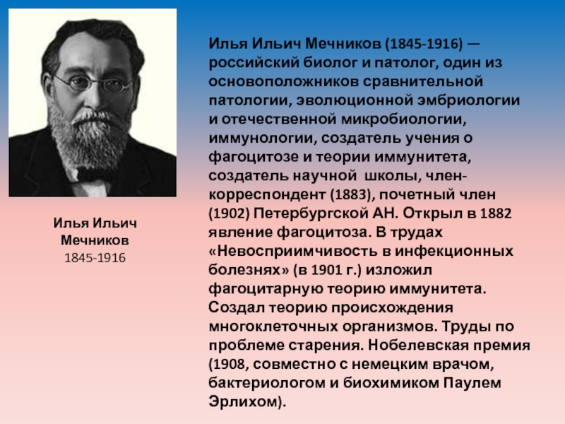 и патолог, один из основоположников сравнительной патологии, эволюционной эмбриологии и отечественной микробиологии, иммунологии, создатель учения о фагоцитозе и теории иммунитета, создатель научной школы, член-корреспондент (1883), почетный член (1902) Петербургской АН. Открыл в 1882 явление фагоцитоза. В трудах «Невосприимчивость в инфекционных болезнях» (в 1901 г.) изложил фагоцитарную теорию иммунитета. Создал теорию происхождения многоклеточных организмов. Труды по проблеме старения. Нобелевская премия (1908, совместно с немецким врачом, бактериологом и биохимиком Паулем Эрлихом).
