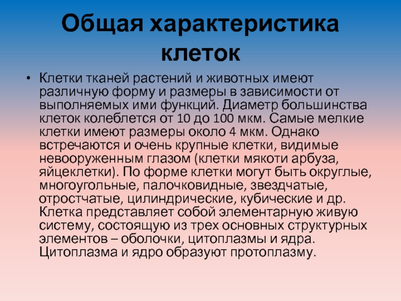 размеры в зависимости от выполняемых ими функций. Диаметр большинства клеток колеблется от 10 до 100 мкм. Самые мелкие клетки имеют размеры около 4 мкм. Однако встречаются и очень крупные клетки, видимые невооруженным глазом (клетки мякоти арбуза, яйцеклетки). По форме клетки могут быть округлые, многоугольные, палочковидные, звездчатые, отростчатые, цилиндрические, кубические и др.