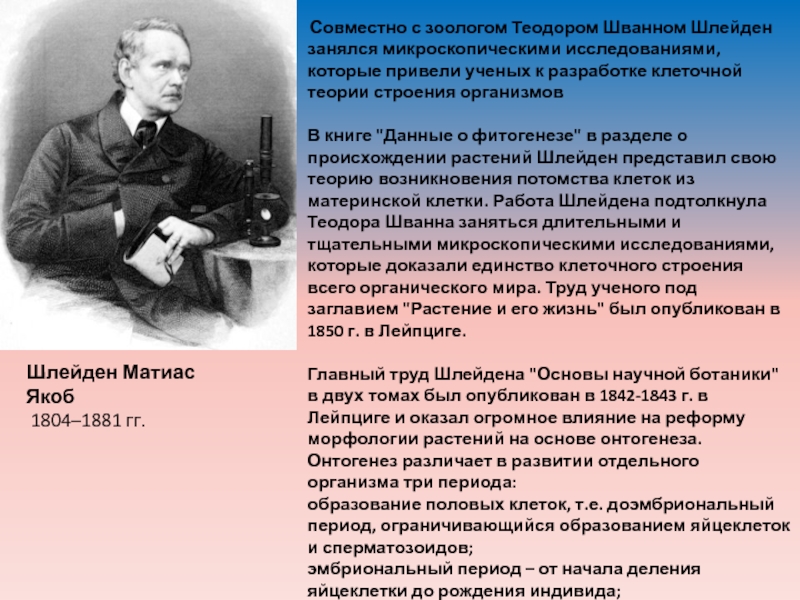 Главный труд Шлейдена "Основы научной ботаники" в двух томах был опубликован в 1842-1843 г. в Лейпциге и оказал огромное влияние на реформу морфологии растений на основе онтогенеза. Онтогенез различает в развитии отдельного организма три периода: