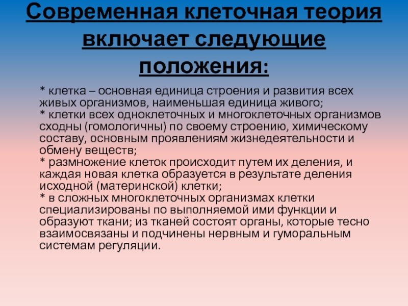 * в сложных многоклеточных организмах клетки специализированы по выполняемой ими функции и образуют ткани; из тканей состоят органы, которые тесно взаимосвязаны и подчинены нервным и гуморальным системам регуляции.