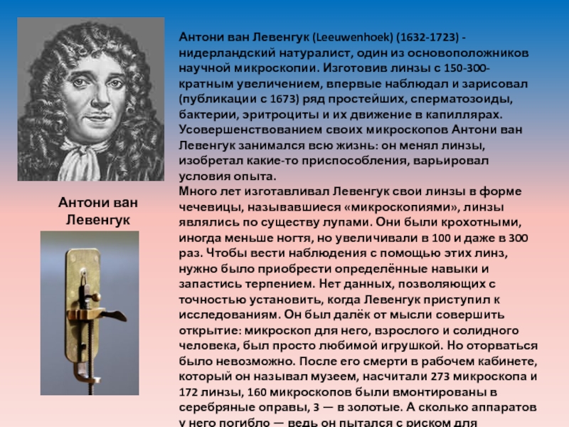 натуралист, один из основоположников научной микроскопии. Изготовив линзы с 150-300-кратным увеличением, впервые наблюдал и зарисовал (публикации с 1673) ряд простейших, сперматозоиды, бактерии, эритроциты и их движение в капиллярах. Усовершенствованием своих микроскопов Антони ван Левенгук занимался всю жизнь: он менял линзы, изобретал какие-то приспособления, варьировал условия опыта.