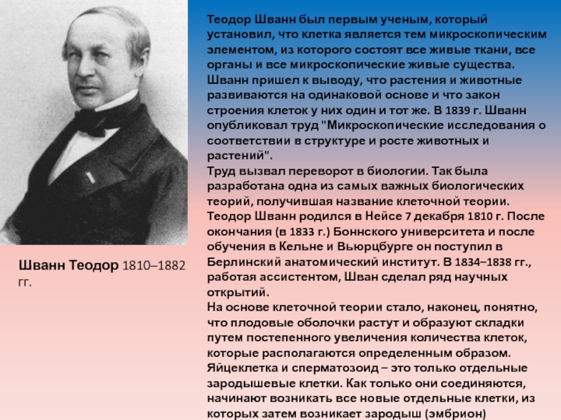 Шванн пришел к выводу, что растения и животные развиваются на одинаковой основе и что закон строения клеток у них один и тот же. В 1839 г. Шванн опубликовал труд "Микроскопические исследования о соответствии в структуре и росте животных и растений".