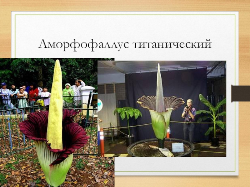 гигант, а точнее гигантское, высотой до 2,6м соцветие, которое также как и цветок раффлезии, испускало ужасающее зловоние. Соцветие это принадлежало растению , называемому аморфофалусом титаническим. Это растение образует в земле огромный клубень, достигающий полуметра в диаметре и 40 кг веса. От клубня отходит очень короткий и толстый зелёный стебель, на котором развивается громадное соцветие – початок, снаружи покрытое чашеобразным гофрированным покрывалом соответствующего размера, причудливо окрашенным в зеленовато – буро – красные тона.