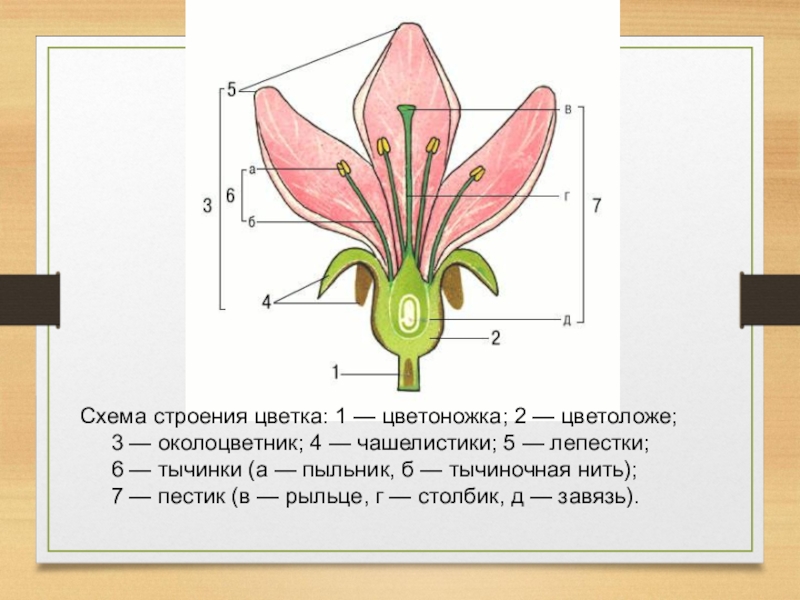 Слайд 5Схема строения цветка: 1 — цветоножка; 2 — цветоложе;