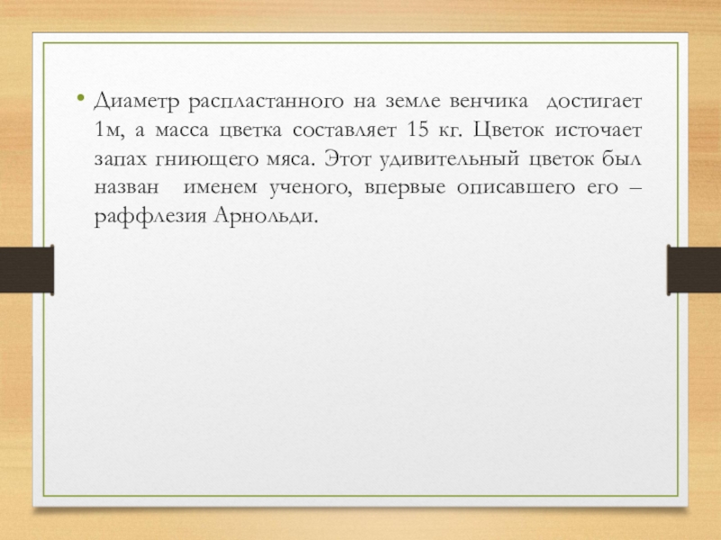 Слайд 18Диаметр распластанного на земле венчика достигает 1м, а масса цветка составляет