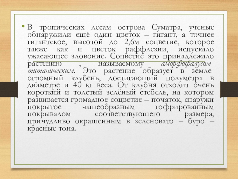 Слайд 19В тропических лесам острова Суматра, ученые обнаружили ещё один цветок –