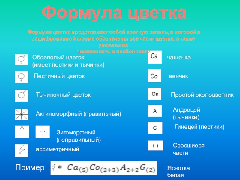 Формула цветка представляет собой краткую запись, в которой в