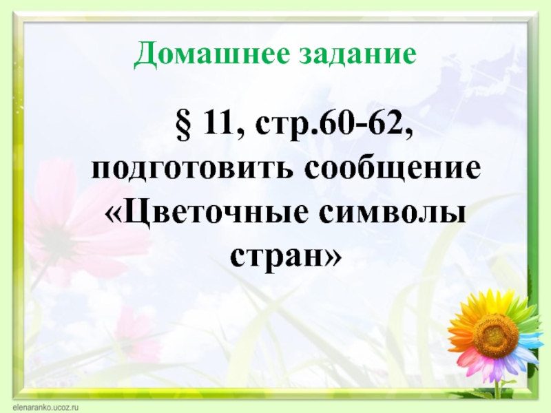 Домашнее задание   § 11, стр.60-62, подготовить сообщение «Цветочные символы стран»