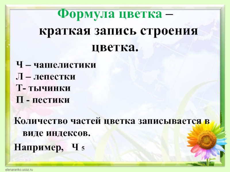 Формула цветка –  краткая запись строения цветка.Ч – чашелистикиЛ – лепесткиТ- тычинкиП - пестикиКоличество частей цветка записывается