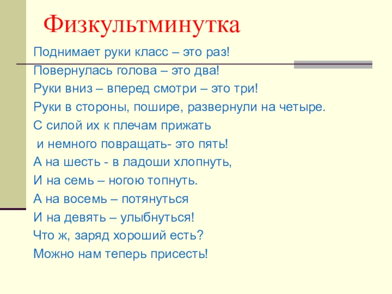 Физкультминутка Поднимает руки класс – это раз!Повернулась голова – это два!Руки вниз – вперед смотри – это