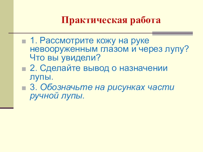 Практическая работа 1. Рассмотрите кожу на руке невооруженным глазом и через лупу? Что вы увидели?2.
