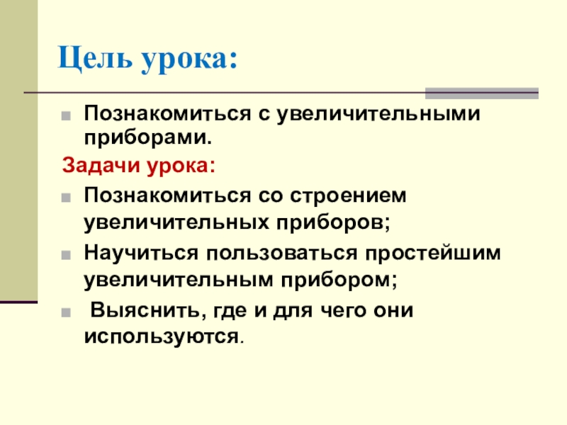Цель урока:Познакомиться с увеличительными приборами.Задачи урока:Познакомиться со строением увеличительных приборов;Научиться пользоваться простейшим увеличительным прибором; Выяснить, где и