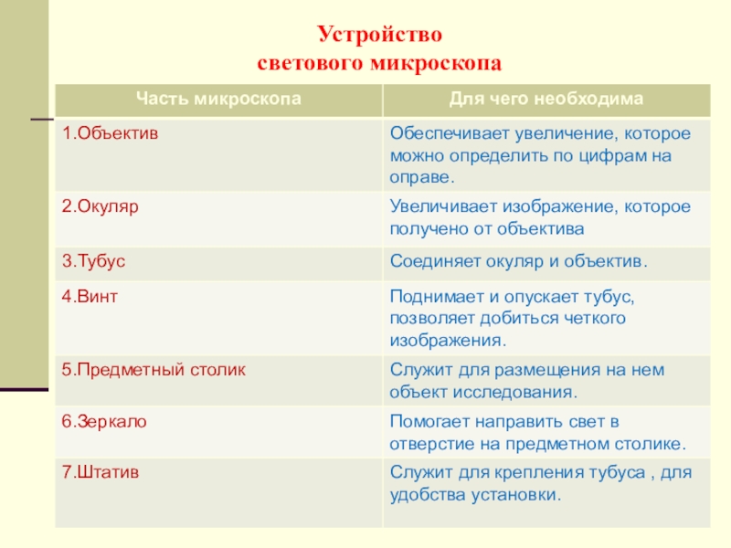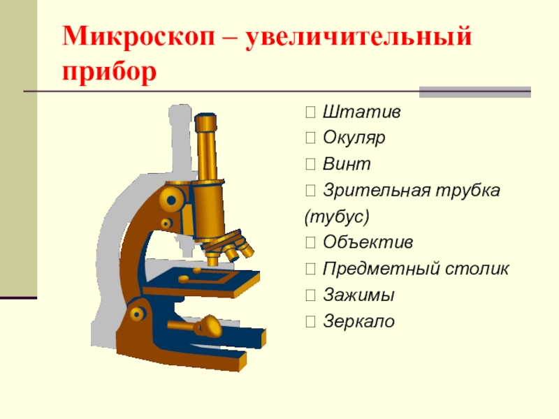 Микроскоп – увеличительный прибор Штатив Окуляр Винт Зрительная трубка(тубус) Объектив Предметный столик Зажимы Зеркало