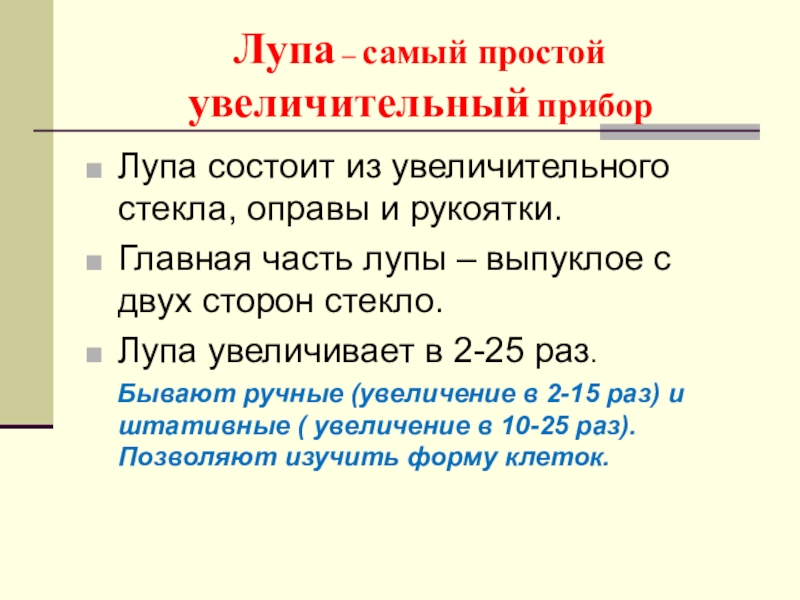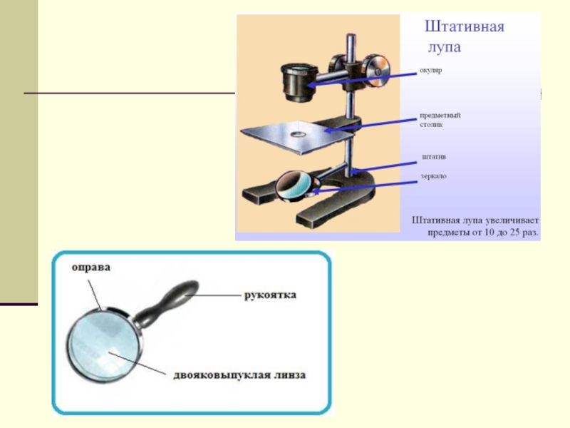 Бывают ручные (увеличение в 2-15 раз) и штативные ( увеличение в 10-25 раз). Позволяют изучить форму клеток.