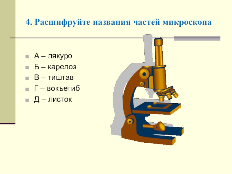4. Расшифруйте названия частей микроскопа А – лякуроБ – карелозВ – тиштавГ – вокъетибД – листок