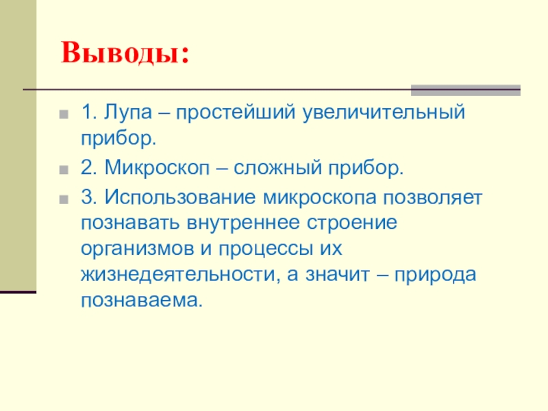 Выводы:1. Лупа – простейший увеличительный прибор.2. Микроскоп – сложный прибор.3. Использование микроскопа позволяет познавать внутреннее строение организмов