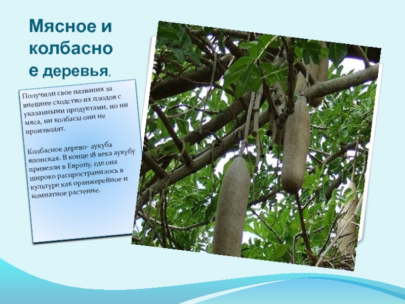 Колбасное дерево- аукуба японская. В конце 18 века аукубу привезли в Европу, где она широко распространилось в культуре как оранжерейное и комнатное растение.