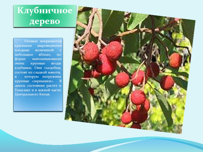 небольшое яблоко, по форме напоминающими очень крупные ягоды клубники. Они съедобны, состоят из сладкой мякоти, в которую погружены крупные «зернышки». В диком состоянии растет в Гималаях и в южной части Центрального Китая.
