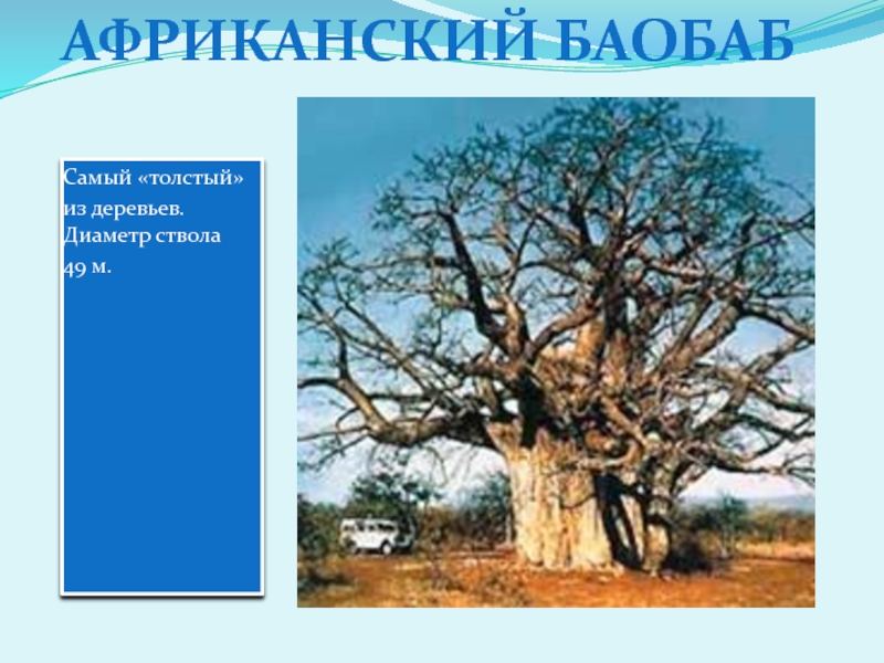 Африки. Имеет мягкую древесину, способную впитать во время дождей и сохранить огромное количество воды, столь необходимой растению в долгие месяцы засухи. Это дерево достигает в высоту 6 метров и более. Ствол обычно толщиной в метр.