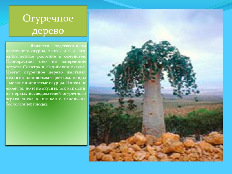 д. это единственное растение в семействе. Произрастает оно на затерянном острове Сокотра в Индийском океане. Цветет огуречное дерево желтыми мелкими однополыми цветкам, плоды – мелкие шиповатые огурцы. Плоды не ядовиты, но и не вкусны, так как один из первых исследователей огуречного дерева писал о них как о маленьких бесполезных плодах.