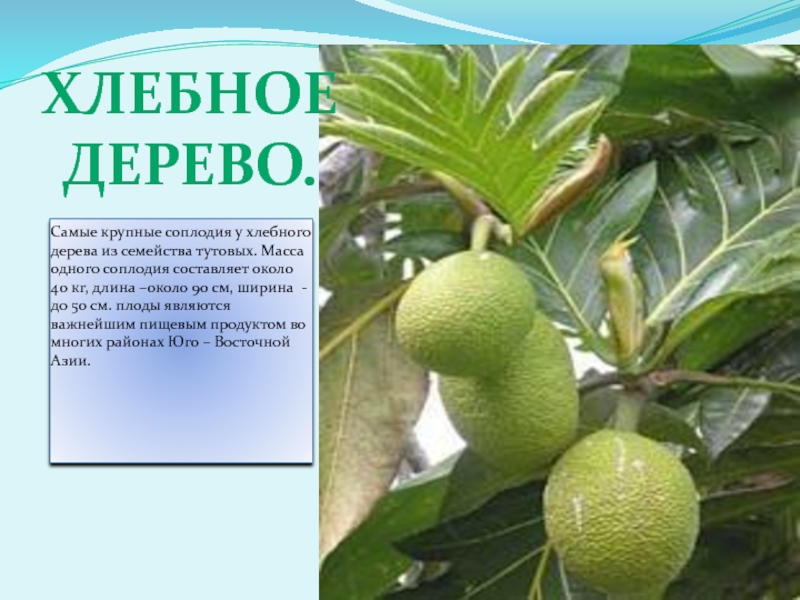 Слайд 3Самые крупные соплодия у хлебного дерева из семейства тутовых. Масса одного