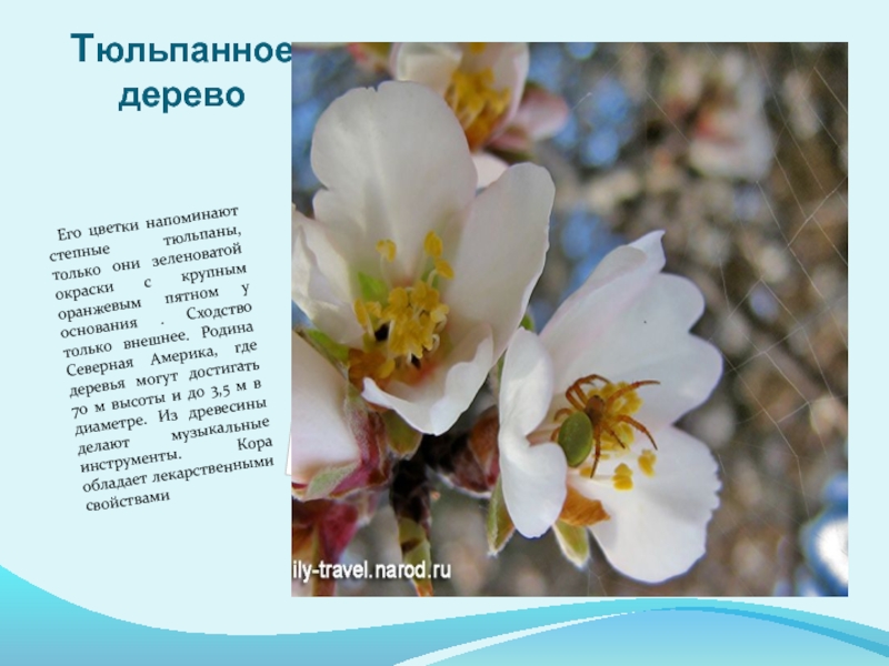 крупным оранжевым пятном у основания . Сходство только внешнее. Родина Северная Америка, где деревья могут достигать 70 м высоты и до 3,5 м в диаметре. Из древесины делают музыкальные инструменты. Кора обладает лекарственными свойствами