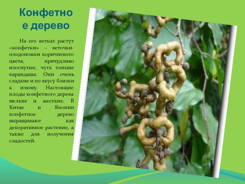цвета, причудливо изогнутые, чуть тоньше карандаша. Они очень сладкие и по вкусу близки к изюму. Настоящие плоды конфетного дерева мелкие и жесткие. В Китае и Японии конфетное дерево выращивают как декоративное растение, а также для получения сладостей.