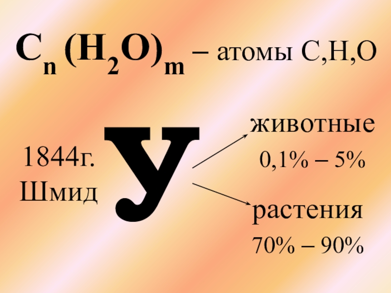 УCn (H2O)m– атомы С,H,O 1844г. Шмид животные 0,1% – 5% растения 70% – 90%