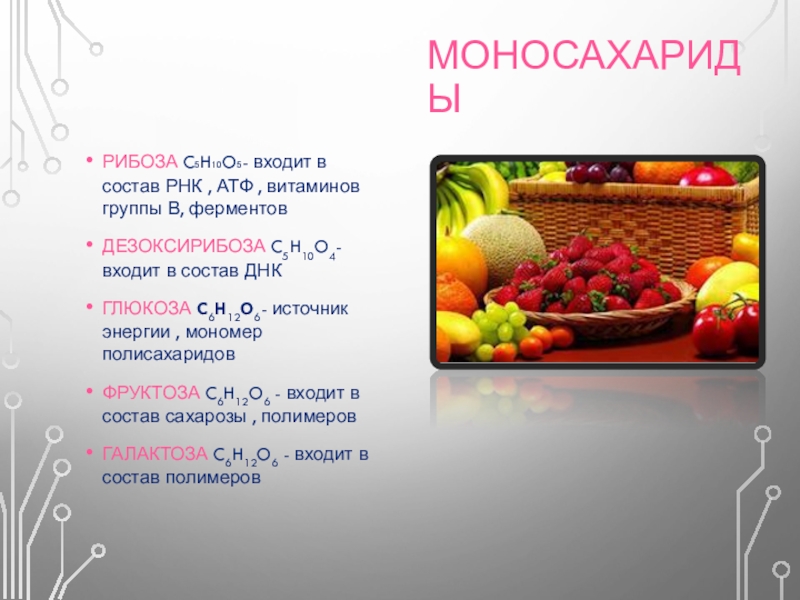 МоносахаридыРИБОЗА C₅H₁₀O₅- входит в состав РНК , АТФ , витаминов группы В, ферментовДЕЗОКСИРИБОЗА C5H10O4- входит в состав