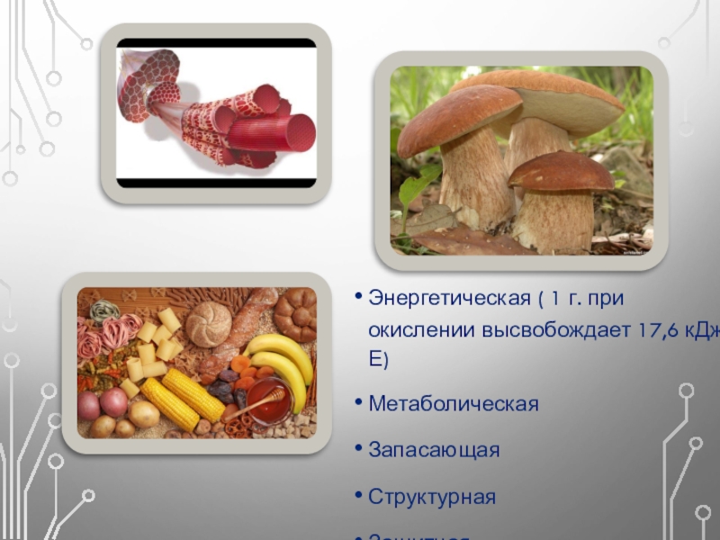 Слайд 8Энергетическая ( 1 г. при окислении высвобождает 17,6 кДж Е)