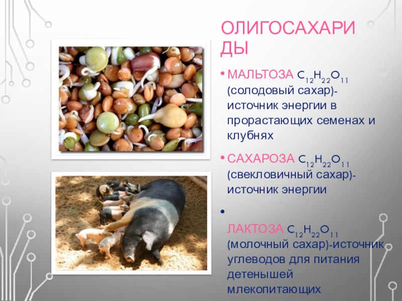 ОлигосахаридыМАЛЬТОЗА C12H22O11 (солодовый сахар)-источник энергии в прорастающих семенах и клубняхСАХАРОЗА C12H22O11 (свекловичный сахар)-источник энергии ЛАКТОЗА C12H22O11 (молочный
