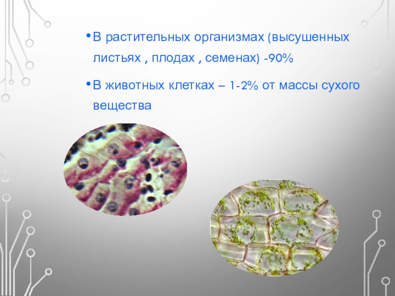 В растительных организмах (высушенных листьях , плодах , семенах) -90%В животных клетках – 1-2% от массы сухого вещества