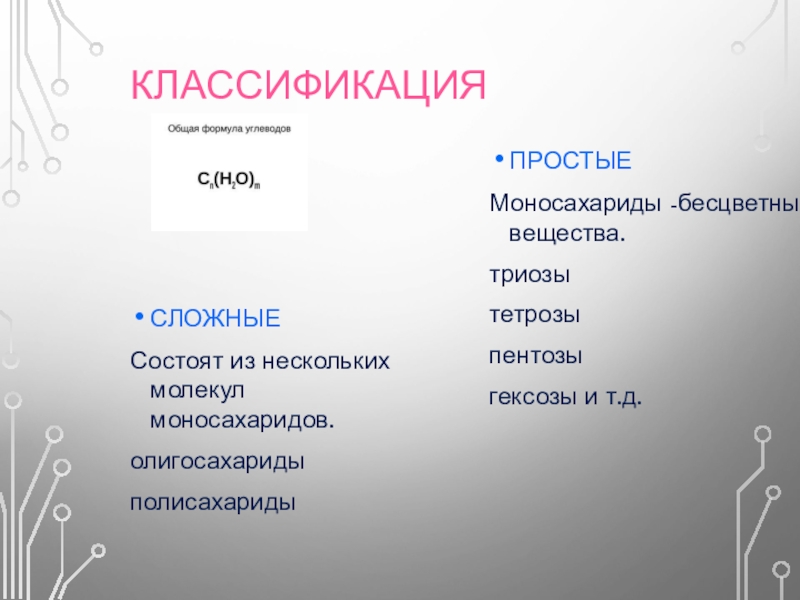 КлассификацияПРОСТЫЕМоносахариды -бесцветные вещества.триозы тетрозыпентозыгексозы и т.д.СЛОЖНЫЕСостоят из нескольких молекул моносахаридов.олигосахаридыполисахариды