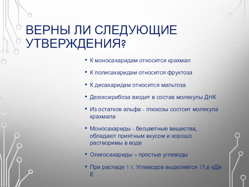 Верны ли следующие утверждения?К моносахаридам относится крахмалК полисахаридам относится фруктозаК дисахаридам относится мальтозаДезоксирибоза входит в состав молекулы
