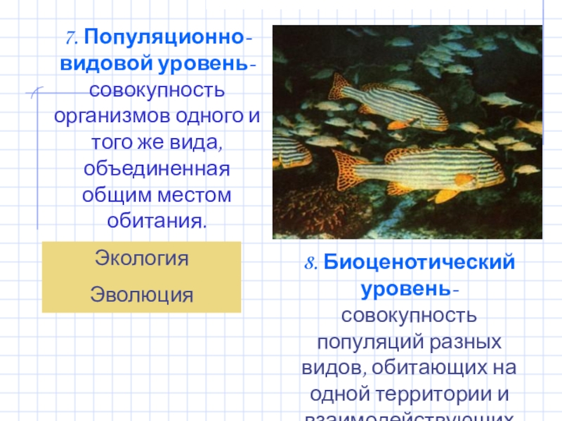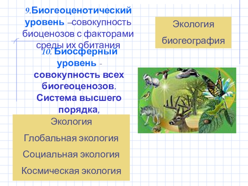 8. Биоценотический уровень- совокупность популяций разных видов, обитающих на одной территории и взаимодействующих друг с другом.
