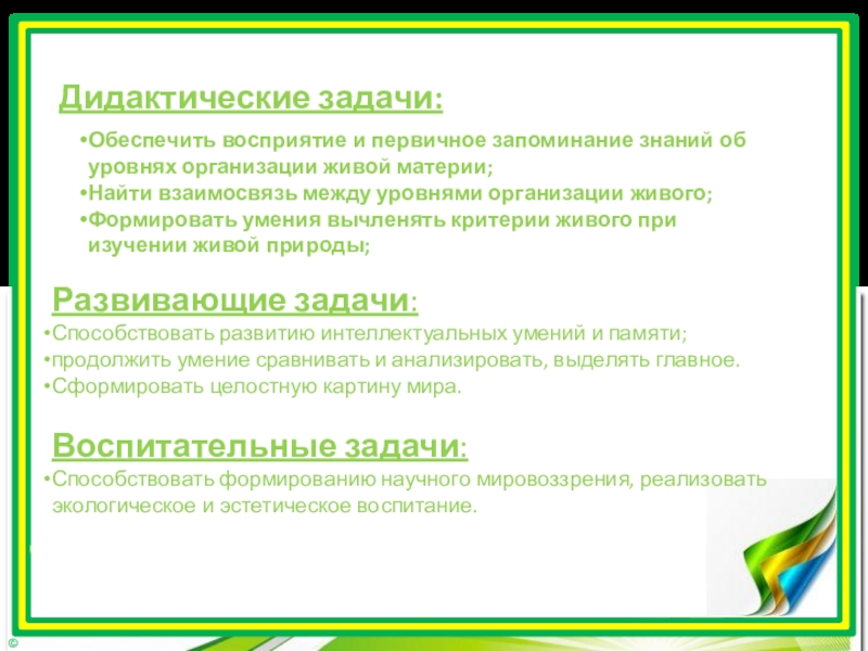 Способствовать формированию научного мировоззрения, реализовать экологическое и эстетическое воспитание.