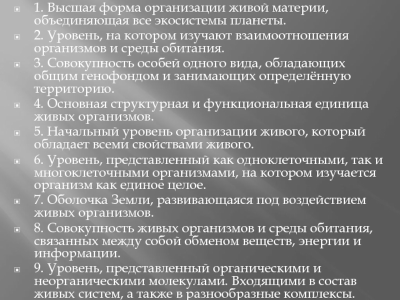 1. Высшая форма организации живой материи, объединяющая все экосистемы планеты.2. Уровень, на котором изучают взаимоотношения организмов и