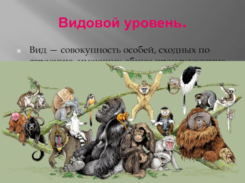Видовой уровень. Вид — совокупность особей, сходных по строению, имеющих общее происхождение, свободно скрещивающихся между собой и