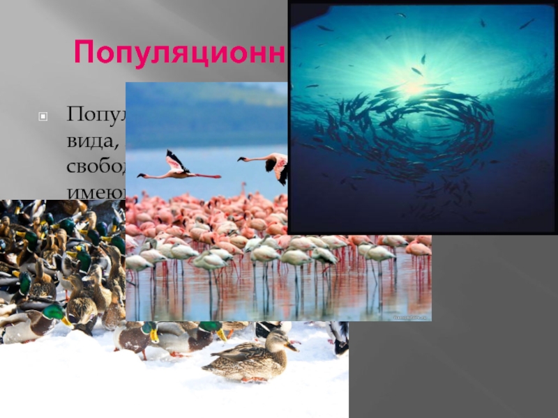 Популяционный уровень. Популяция — совокупность особей одного вида, занимающих определенный ареал, свободно скрещивающихся друг с другом, имеющих