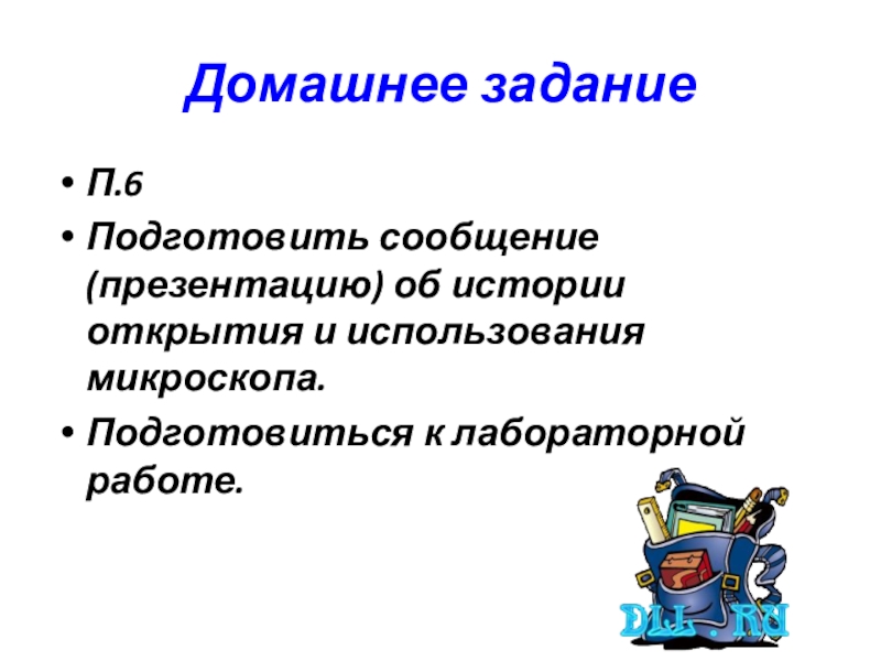 Домашнее заданиеП.6Подготовить сообщение (презентацию) об истории открытия и использования микроскопа.Подготовиться к лабораторной работе.