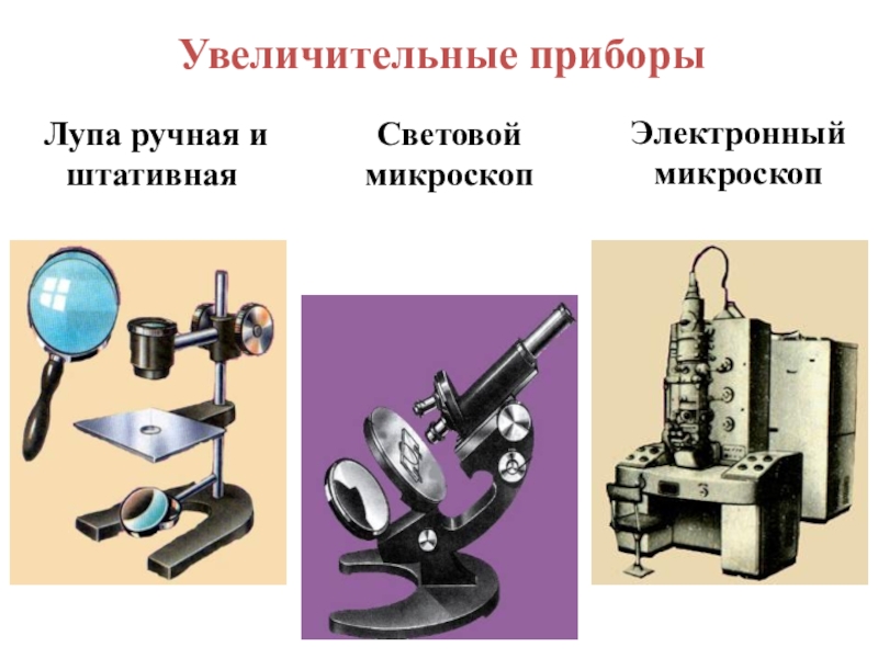 Лупа ручная и штативнаяСветовой микроскопЭлектронный микроскопУвеличительные приборы