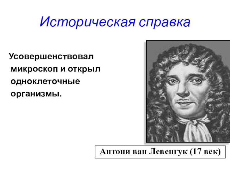 Историческая справкаУсовершенствовал микроскоп и открыл одноклеточные организмы.Антони ван Левенгук (17 век)