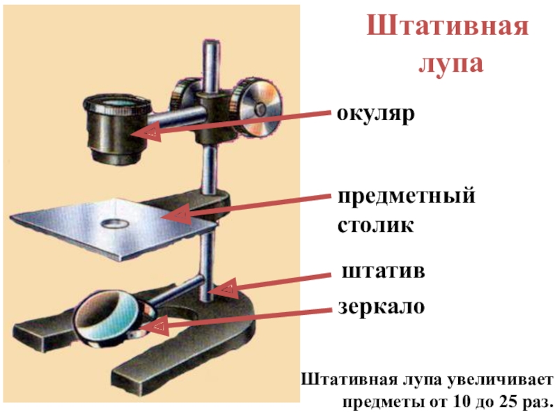 Штативная лупаштативзеркалопредметныйстоликокулярШтативная лупа увеличиваетпредметы от 10 до 25 раз.