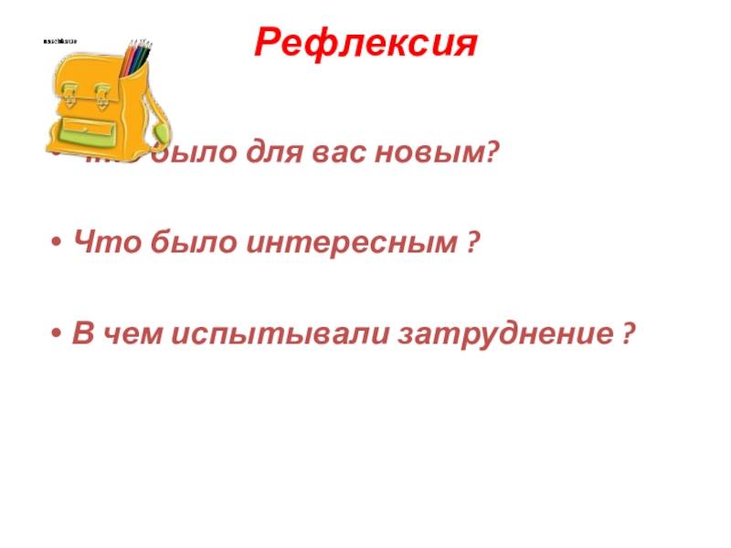 Рефлексия  Что было для вас новым?Что было интересным ?В чем испытывали затруднение ?