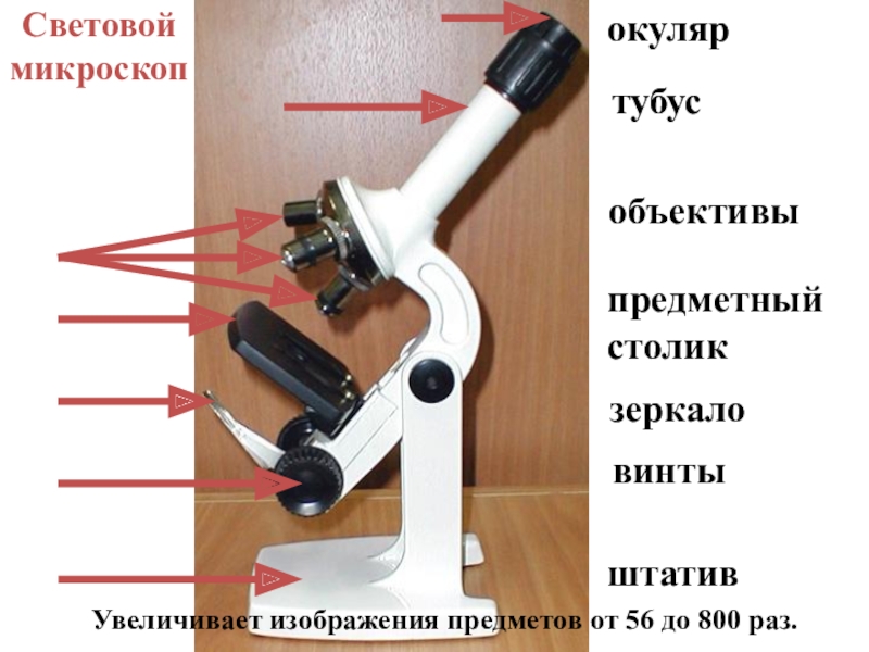 Световой микроскоп  Увеличивает изображения предметов от 56 до 800 раз.окуляртубусобъективыпредметныйстоликзеркаловинтыштатив