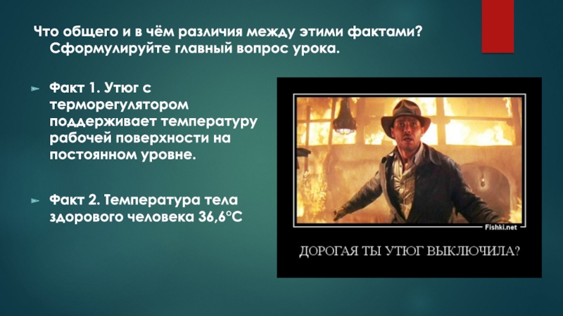 Факт 1. Утюг с терморегулятором поддерживает температуру рабочей поверхности на постоянном уровне.
