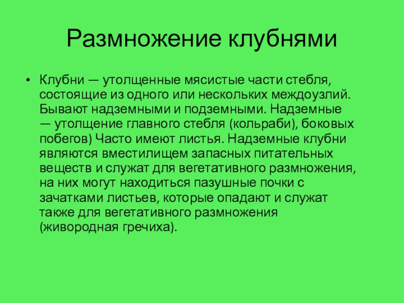 нескольких междоузлий. Бывают надземными и подземными. Надземные — утолщение главного стебля (кольраби), боковых побегов) Часто имеют листья. Надземные клубни являются вместилищем запасных питательных веществ и служат для вегетативного размножения, на них могут находиться пазушные почки с зачатками листьев, которые опадают и служат также для вегетативного размножения (живородная гречиха).