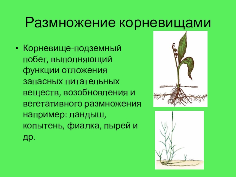 вегетативного размножения например: ландыш, копытень, фиалка, пырей и др.